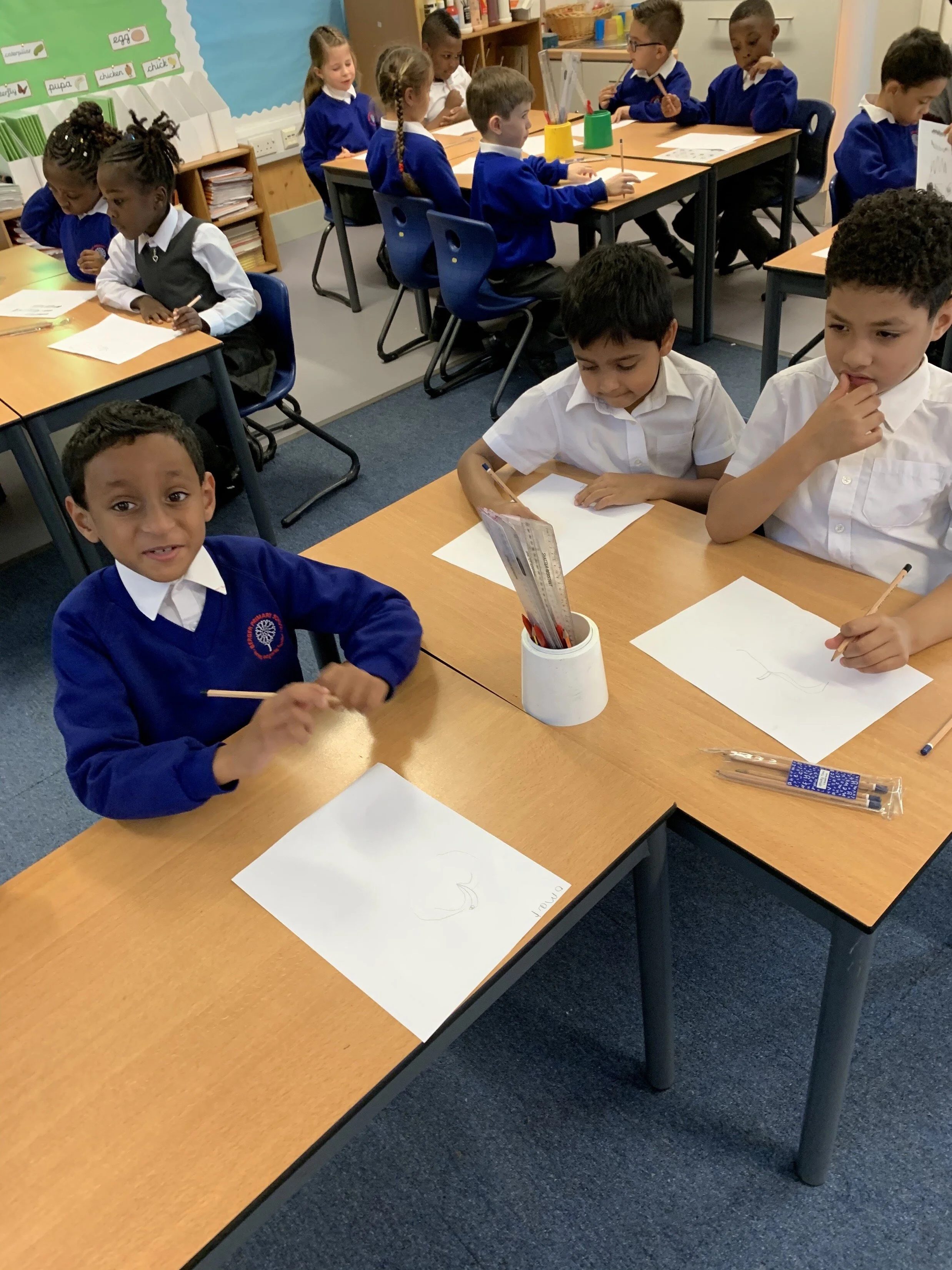 In art we are learning about different pencil grades and skills to create different marks on the paper.