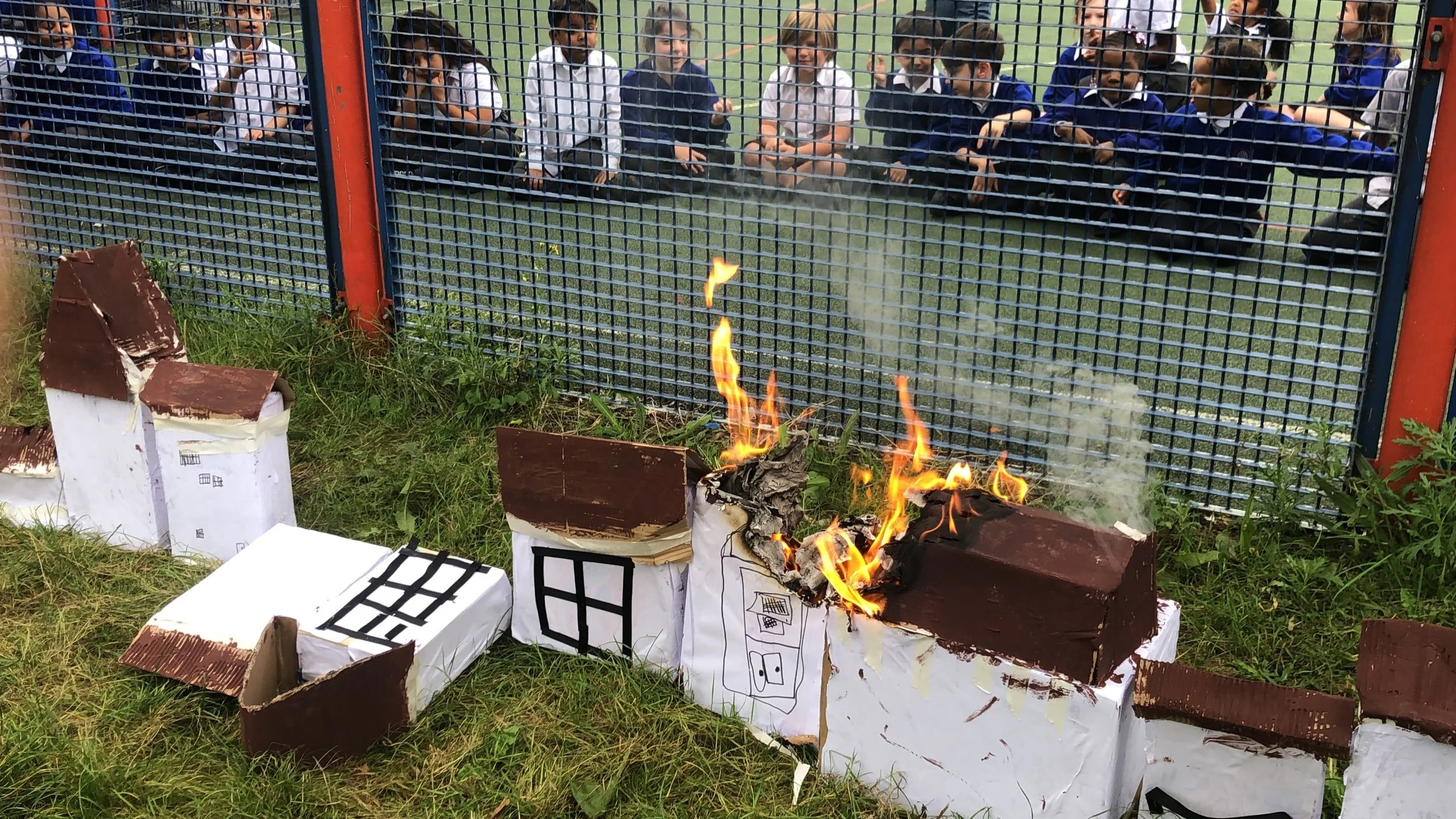 We watched our Tudor houses burn to re-enact the Great Fire of London. We used our senses to think about what we could smell, observe, hear and feel emotionally. We were also able to make links with our Science topic, by thinking about flammable materials and whether having the houses spread apart slowed down the fire. It was a great learning experience!